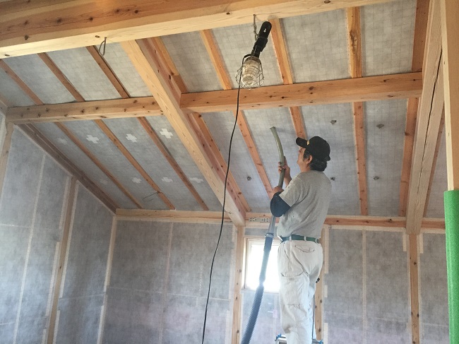 発泡ウレタンのように固まる訳ではないので、垂木間・柱間に充填するには予め不織布を貼ってから、材料を吹き込みます。