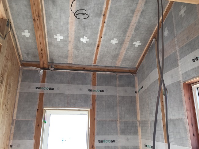 屋根の外張り断熱は遮熱シート付のキューワンボードでしたが、壁の外張り断熱はEPSボード40mmです。