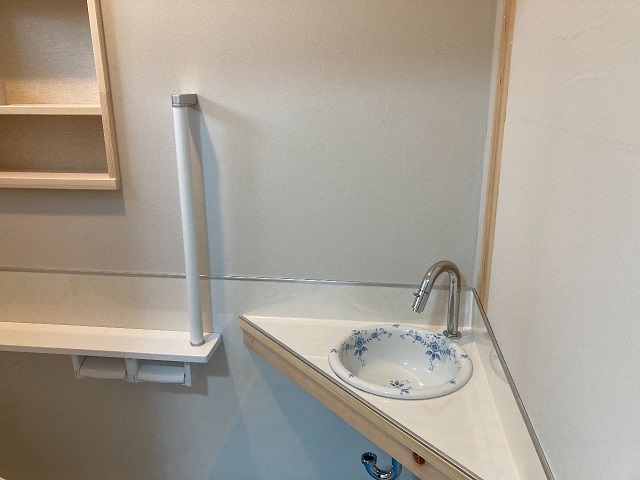 トイレの手洗いは、エッセンス(伊吹物産)のオーバーカウンター型手洗器「Mラウンド」