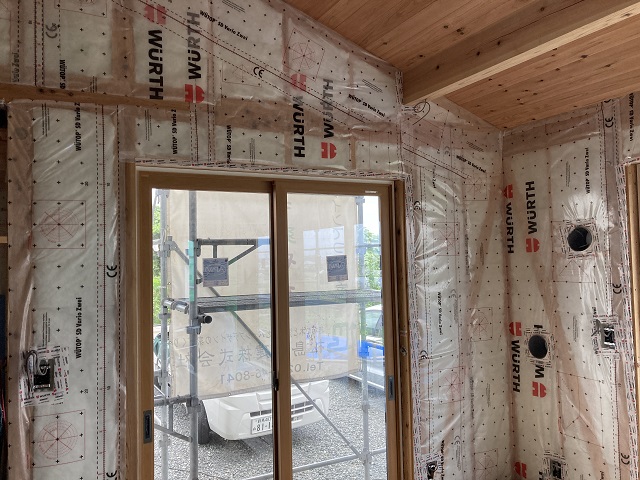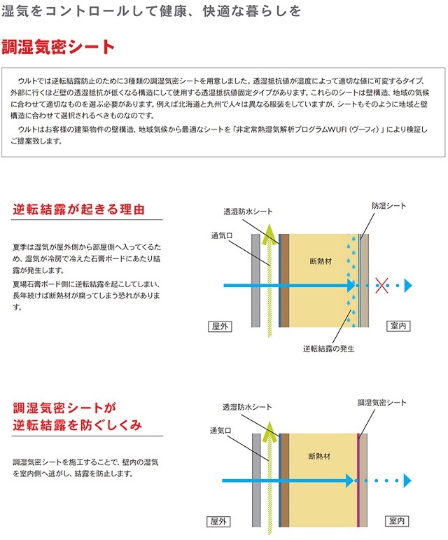 また、外壁側に透湿防風シートを張るように、室内側の気密シートも調湿性能のある気密シートがあり、室内の湿気は内壁に通さず、内壁の湿気は室内に排出する優れもので、弊社ではウルトの調湿気密シートでの施工を行っています。