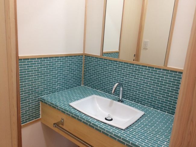 ↑ 高崎平屋の家の洗面ですが、このところ洗面にはモザイクタイルを張ることが多くなってきました。また、水栓も今回から自動水栓にしました。