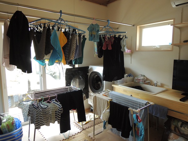 右からTV、作業台、病院用流し、洗濯機、そして室内物干し、テラス窓の外はバルコニー物干しと揃ったランドリールーム。