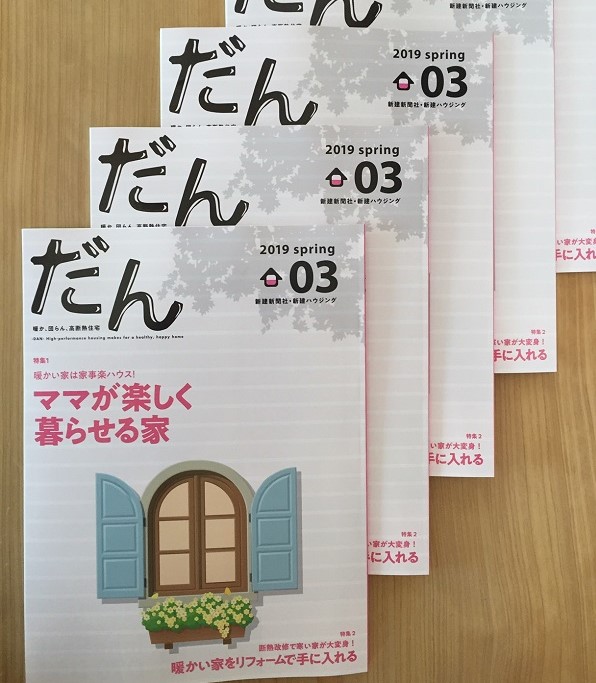 新建ハウジング社にて、2018年秋から発行の季刊誌「だん」暖か、団らん、高断熱の3つのキーワードをテーマに年4回発行の住宅誌です。