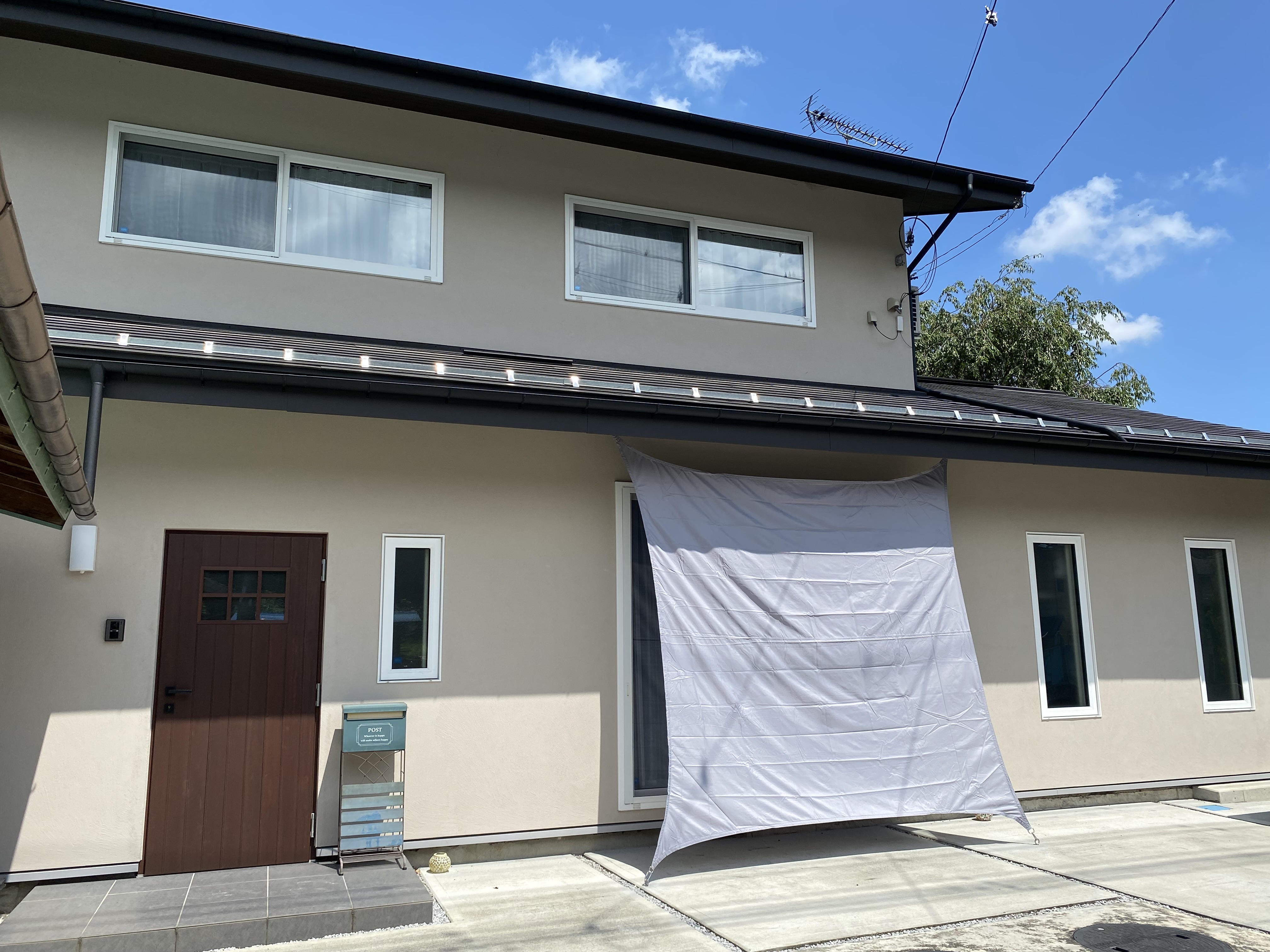 先日倉渕町でリノベーションをしたお家の西側の大開口部分にシェードを設置しに康之さんと行ってきました。シェードの設置工事は初めてで、どんな感じに付くのかなぁ?と自分が付けるにも関わらず、他人事のようにワクワクしていました。そして現場に行くと「この金具4カ所、付ける位置を出して印を付けて終わったら呼んで!」と役割を与えられ、「そうか、俺が設置するんか」と心の中で少し焦りました。初めてだったので、窓からどのくらい離すのかであったり、窓のどの位置に付ければ効果が最大限に発揮されるのかであったり色々考え、ネットでもどの位置が一番日射の遮蔽効果が大きいのか調べました。しかし、細かな位置などの情報は載ってなく、西側の窓に付けると効果が大きいと書いてあったので「真ん中でいいか」と思い金具の位置を出すために採寸を始めました。