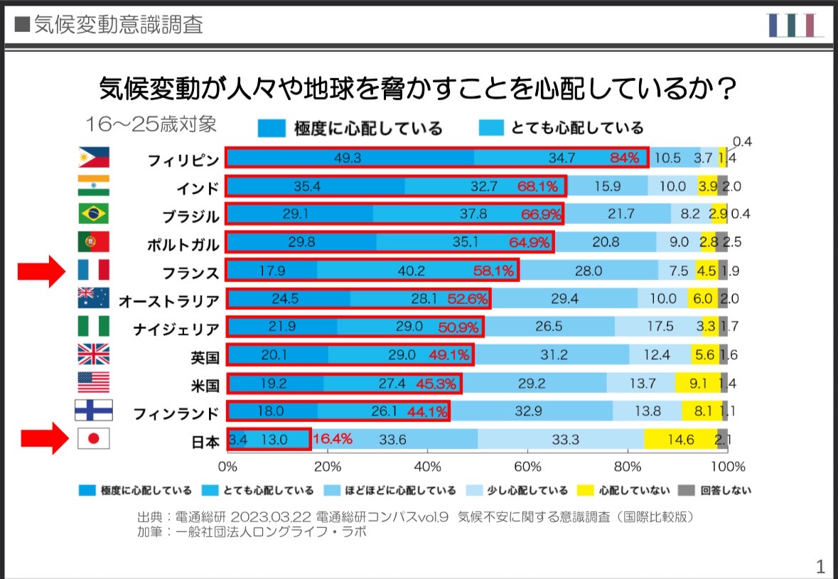 今も含めて未来の地球を心配することをたくさん報道しているし、夏はかなり暑く冬は寒いなど生活しにくい環境になっているにもかかわらず、日本人が気候変動に関して『極度に・とても心配』の割合が他の国と比べてかなり低い割合だったんです。