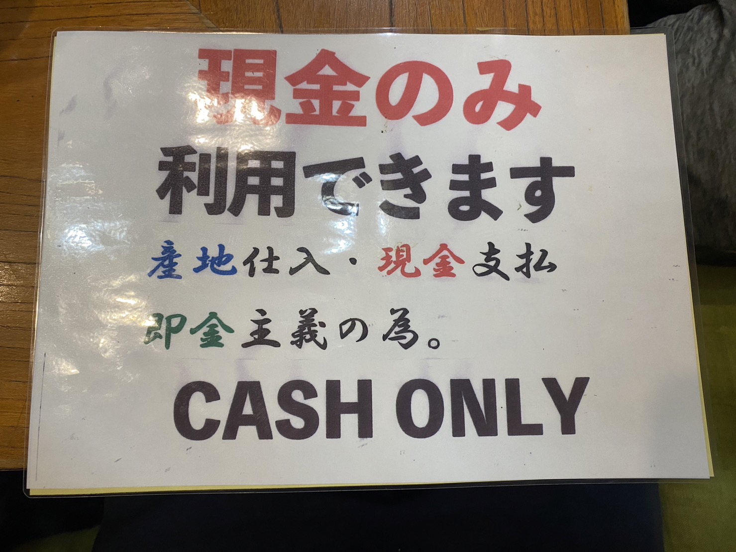 カード決済、ORコード決済が主流の時代にもかかわらず、このお店は現金支払いのみでこんなものがメニューの裏に挟んであります。僕はあまり現金を持ち歩かない主義なので、カードが使えないとなると「時代遅れだなぁ」と思うことがあり、今回もそう思いましたが『即金主義の為。CASH ONLY』という文字に目を惹かれ思わず写真を撮ってしまいました。