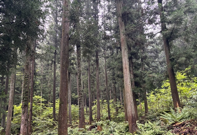 樹齢60年前後の杉の木が主であって、6~7年に一度は間伐していますので、良い木が残り下草も生えた健全な森林となっています。
