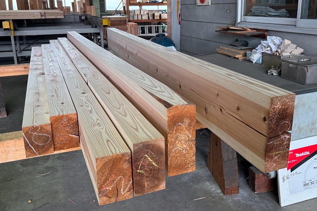 また今日はプレカット工場に土台大引きの引き取りに行ってきましたが、天然乾燥の杉の梁は加工待ちとなっていました。