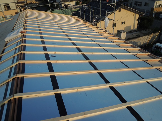 また、通気層はただの空気層ではなく、軒先に通気の入口があり、棟に通気の出口(換気棟)があって、熱せられた空気を通気させ熱気がこもる事無く、この通気層で輻射熱と伝導熱を遮断し、遮熱層と通気層を効率良く働かせています。