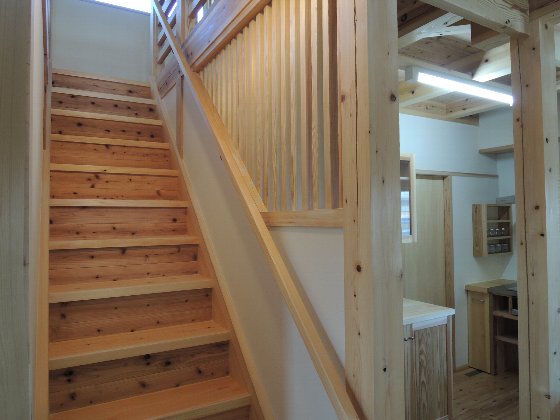階段の手すりも、桧の柾目棒40mm角のオリジナル手摺です。