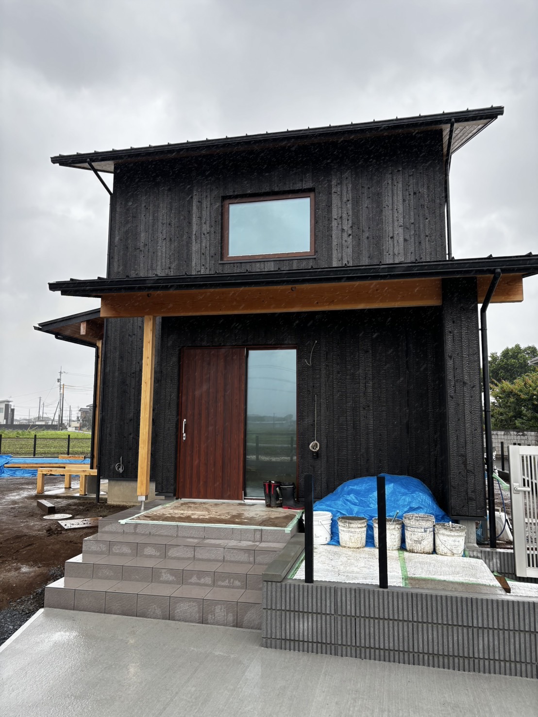 その商品が実際の建物に付くとどんな納まりでどんな雰囲気になるのか見てみたいということもあり今回参加させていただきました。ベースポイント株式会社さんの物件は、外はあいにくの雨でしたが外壁の焼杉と存在感のある木製窓の外観がめちゃくちゃ映えていてかっこよかったです。