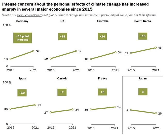 世界で第5位の温室効果ガスの排出国である日本ですが、2021年9月14日、米シンクタンクのピュー・リサーチ・センターが、17の国と地域、18,000人対象に気候危機や地球温暖化対策について意識調査を行い、その結果が下図の通りで、他のほとんどの国では「非常に懸念している」という回答が2015年より大幅に増えている一方、日本は逆に減っているという結果でした。