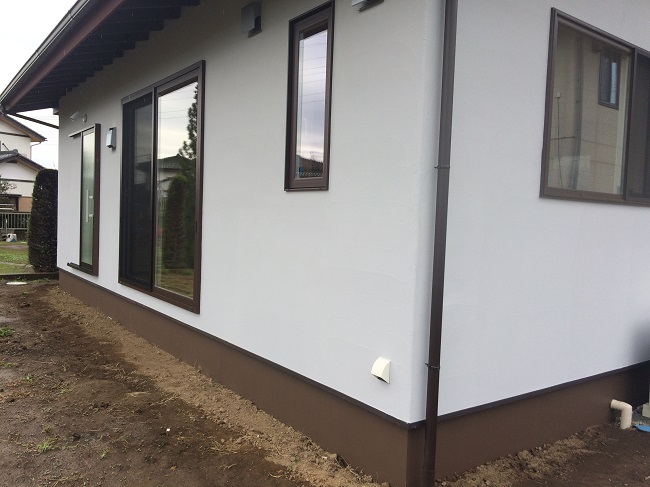 基礎廻りはモルタル色が通常ですが、壁の色がモルタルと同じような色なのでサッシや軒裏と同色のブラウンにしてみましたところ、建物が引き締まった感じとなり、とても良いです。