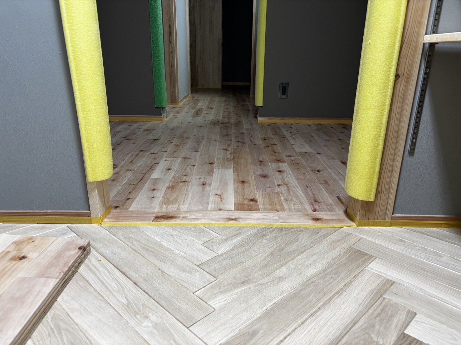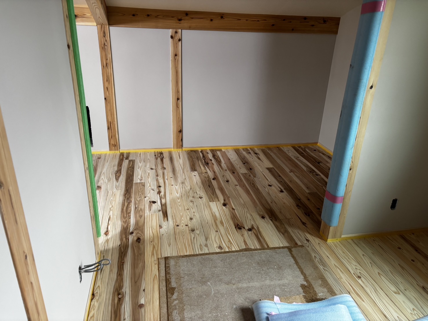 張り終わった床板は、長いやつだと3カ月も養生シートの下に隠れて他の作業が終わるのを静かに待ってくれています。端の方は見えている板が少しあり、その板たちは石膏ボードや木屑などを浴びながらも「自分という存在をアピールできる時はまだかな~」と気長に待ってくれていました。