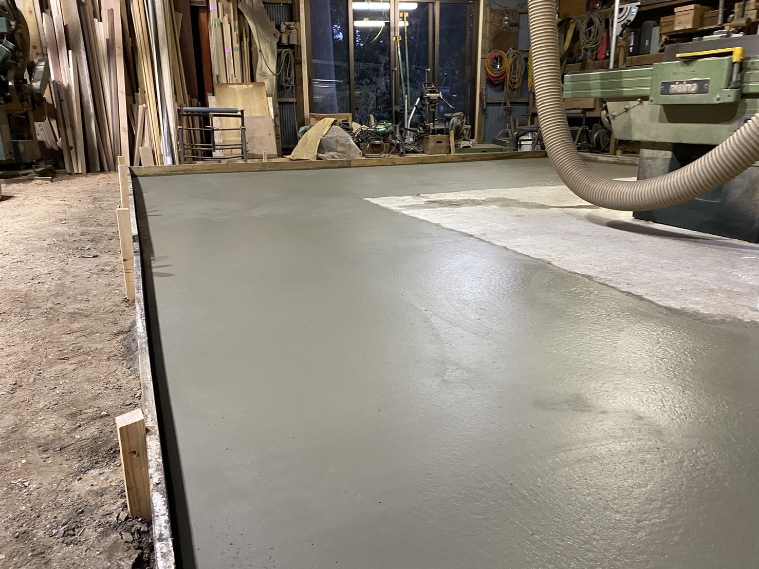 しかし、今回は前回とは違い、範囲が広くいつも使う場所になるため正確さときれいさが求められます。やりたい気持ちは山々でしたが、今回は手を付けず一輪車でコンクリートの運搬に全力を尽くしました。気温は一桁と寒かったですが、打設場所までは上り坂でかなりの運動量でしたので寒いという感覚は無く、汗をかきながらの作業でした。左官仕事の上達はありませんでしたが、太ももは一回りがっちりしました(笑)。