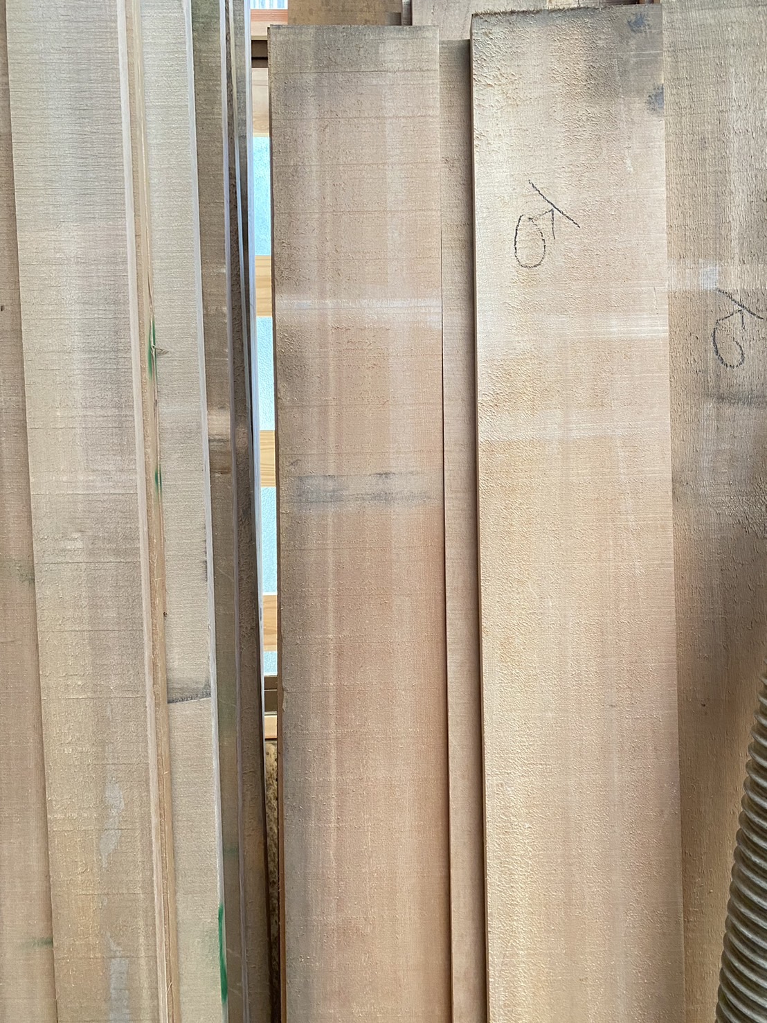 ↑スプルス。建具材などに使われる木です。名前はすぐに覚えましたが、どれがスプルスなのかは判断できず、自分にとってはまだ未知の木。この板を見た時、目の感じがツガに似てると思いました。