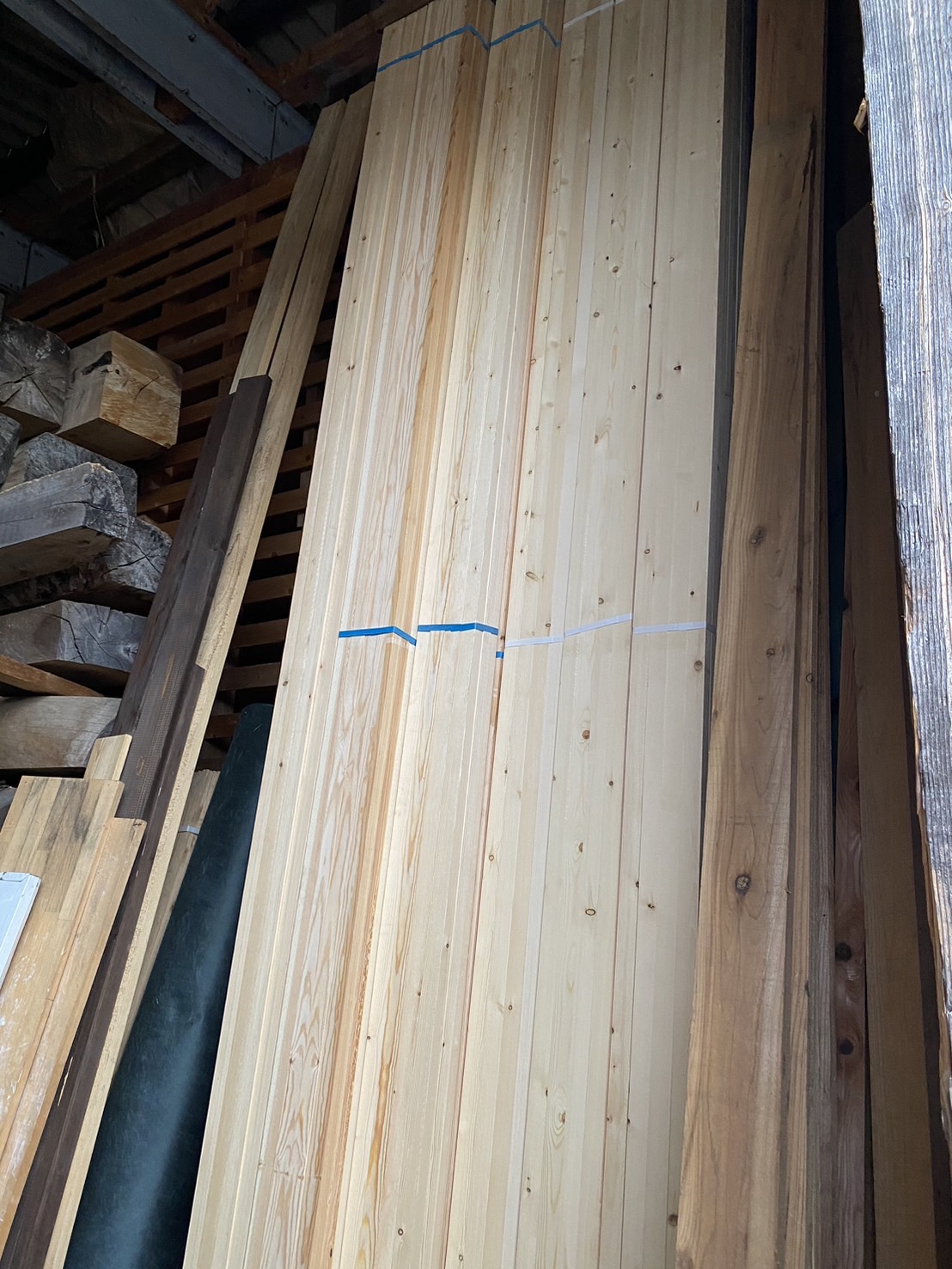 ↑赤松。野縁で使っていて、切った時に結構匂いがするのですが、僕は好きな部類の匂いです。赤という字が入っていますが、色は白とか黄っぽいです。最初の頃はヒノキと勘違いしていました。野縁は1束12本なのですが、重いので運んだり立てかけたりするのが嫌になります(笑)