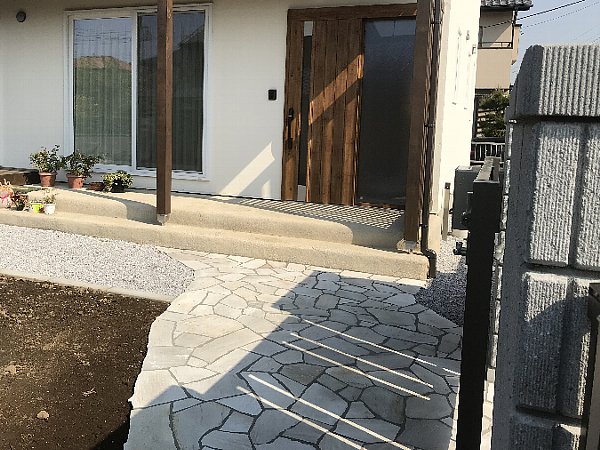 門扉から玄関までも敷石でアプローチ外構。