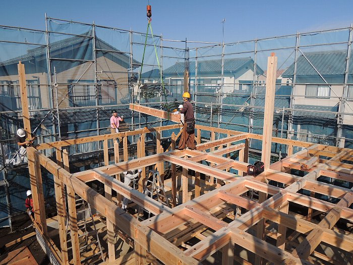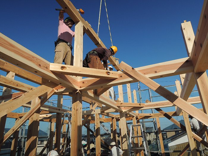 雲一つない秋の晴天に恵まれ、杉の梁・桁が組まれていきます!