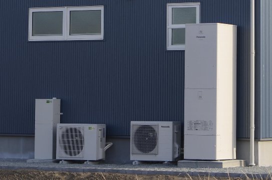 画像の右はエコキュート、左は電気温水暖房装置です。