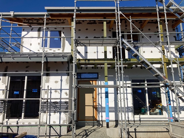 前橋では外壁のSTOロータサン塗り壁の下地塗りが進行中です。