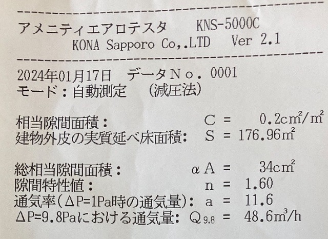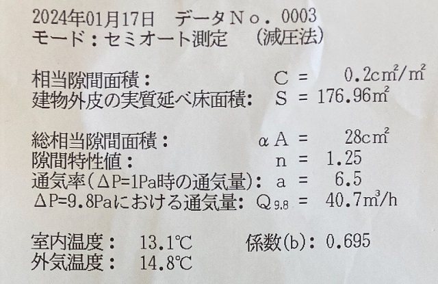 また最後に気密測定の業者さん曰く、「これまで0.5前後であったのが1.0以上になる結果の建築屋さんが何社かあり、それは資材高騰により気密のやり方を変えてコストダウンを図った結果みたいです。」と、資材の値上がりがこんなところに影響を与えているようです。