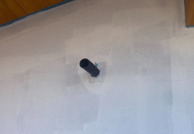そして今回見つかったその個所は2ヶ所あり、1ヶ所は玄関ドアの枠の下で、そこは最終的にはコンクリートを打ち込み塞ぐ場所なので、一時的にテープで塞ぐ処置をし、あとの1ヶ所は太陽光の配線スリーブで、そこも同じく太陽光を設置すれば隙間は塞がるところなので、一時的にテープを張り、次の計測に掛かりました。