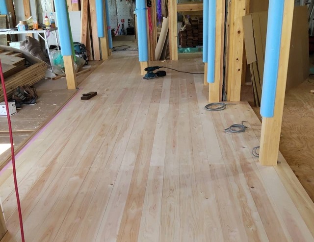 玄関からキッチン、そしてリビング、書斎、トイレと27mm厚の桧無垢床板張っています。