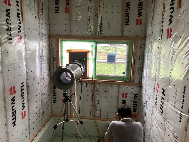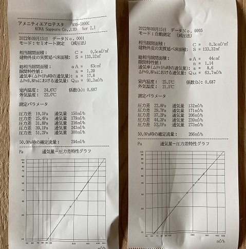 目標C値は0.5㎠/㎡以下ですが、こちらのお住まいは玄関戸が片引き戸(YKKコンコード)であることと、建物正面に広がる榛名山の眺望を重視しての、引き違いのテラス窓が4か所あると言う事で、漏気の箇所が多目から0.6~7前後を予想していましたが、結果はC値=0.5でした。