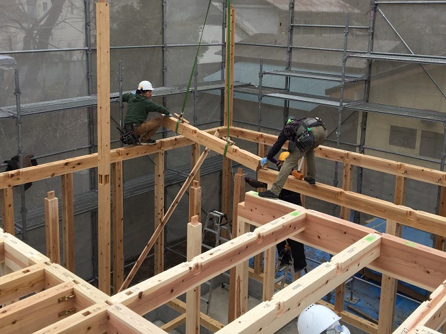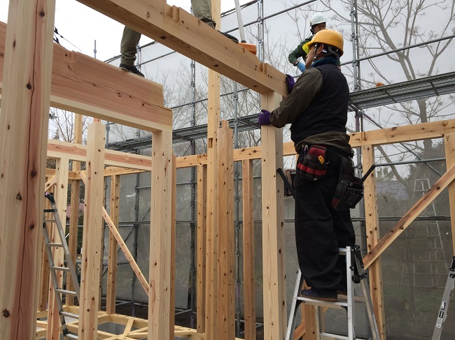 1階の柱から始まり2階の床梁と、3年以上自然乾燥を施した地場の良質な杉材です。