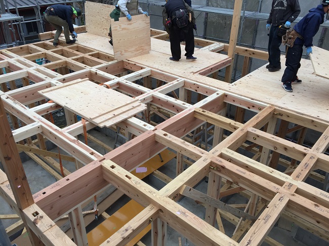 2階の床梁組の後に建物の垂直を正す屋起こし行い、その後2階の床下地の根太レス合板24mmを設置します。