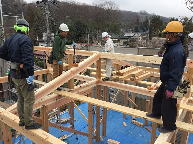 大工さんを始め、屋根屋さんや材木屋さんの職人さんたち10名にて、チームワーク良くそれぞれの持ち場で皆さんの活躍により、建て方は進行しています。