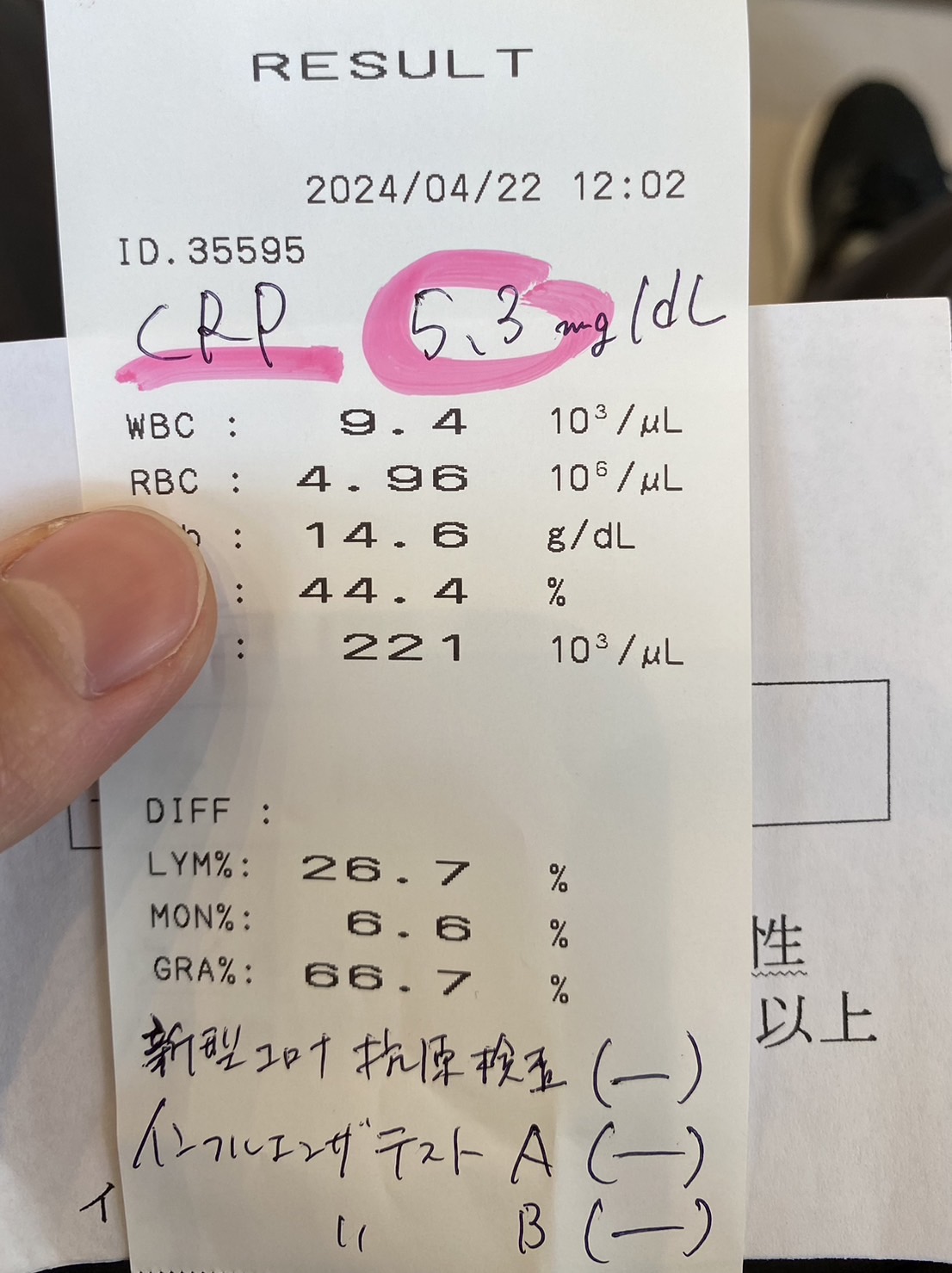 そして案内された診察室へ入ると80歳、いや90歳?近い白髪の先生がいて「こんにちは、お座りください。松島さんねぇ、コロナとインフルは陰性でしたよ。去年の7月に来た時と症状が似ているよね?それのぶり返しなんじゃないかな。あ、これ、血液検査の結果ね。このCRPっていうやつの数値見て。0.4以下が正常値なんだけど、松島さんは5.3。白血球の数値もかなり高いね。」と説明を受けました。