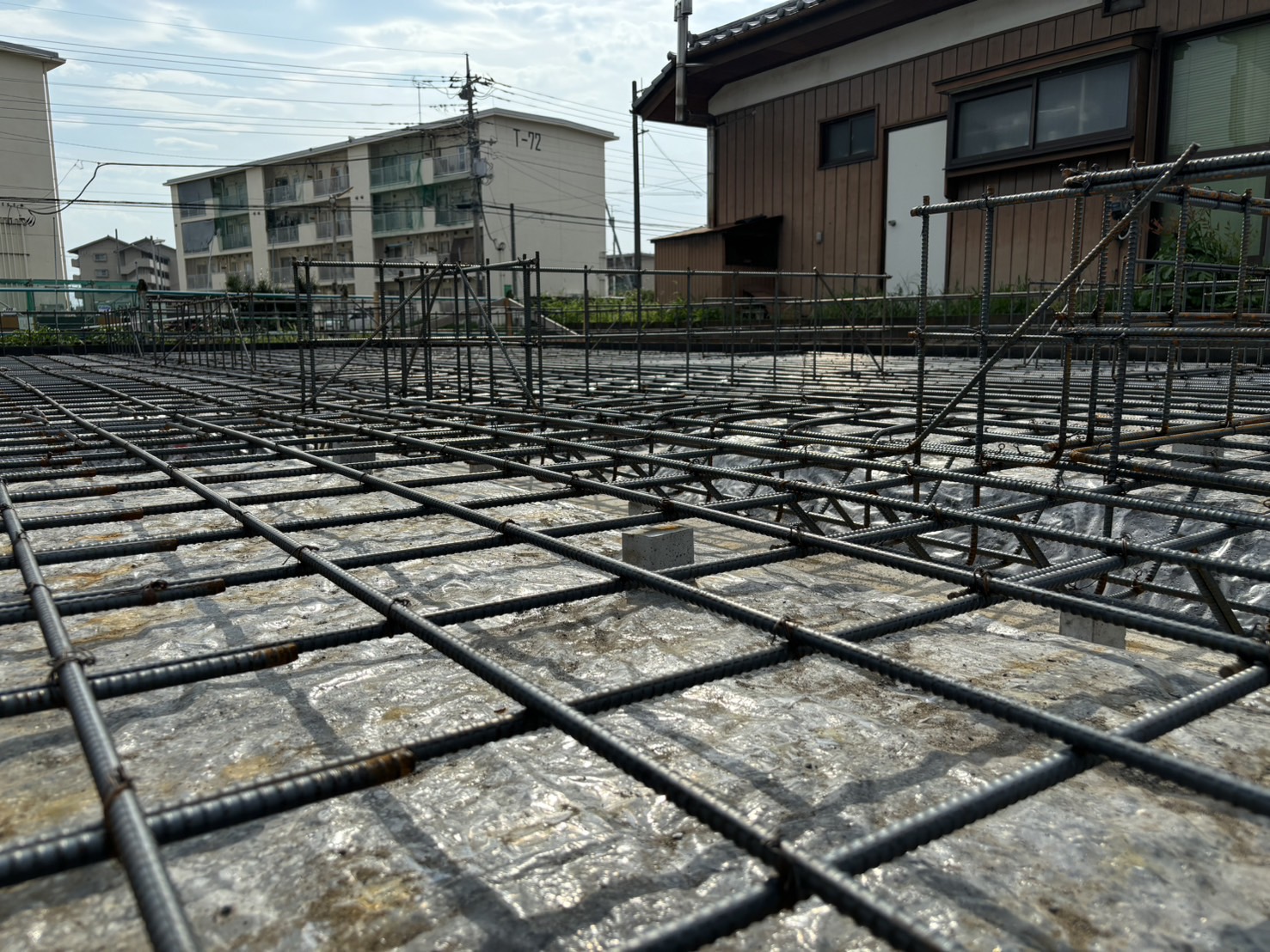 関東地方では今週梅雨明けが発表されました。これから気温が35℃を超える猛暑日が続くと思うと恐ろしさで身が震えそうです。今週は30℃までいかない日があったり、35℃近くまでいった日がある中、伊勢崎の新築現場では鉄筋屋さんに基礎の鉄筋を組んでいただきました。