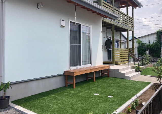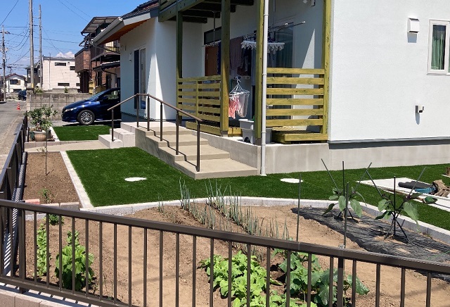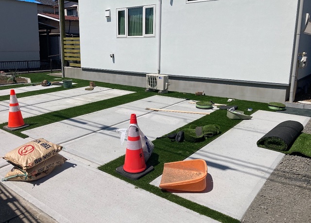 外構は、土間コンクリートの駐車スペースに玄関アプローチ、そして一部花壇や畑の土エリア。 そして一年中緑を保つ人工芝の工事でした。