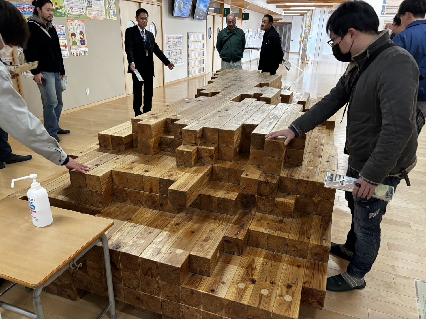 今回は二回目の共同企画で、木村木材の木村さんがみどり市の協力を得てとても貴重な機会を作っていただきました。笠懸西小学校は木造の建物というわけではありませんが、教室の床や廊下の天井、吹抜けや体育館のルーバーなどにみどり市産の木材をふんだんに利用した建物です。もし災害が起きた場合にも避難所として利用できるための仕掛けもたくさんあり、とてもワクワクする小学校でした。