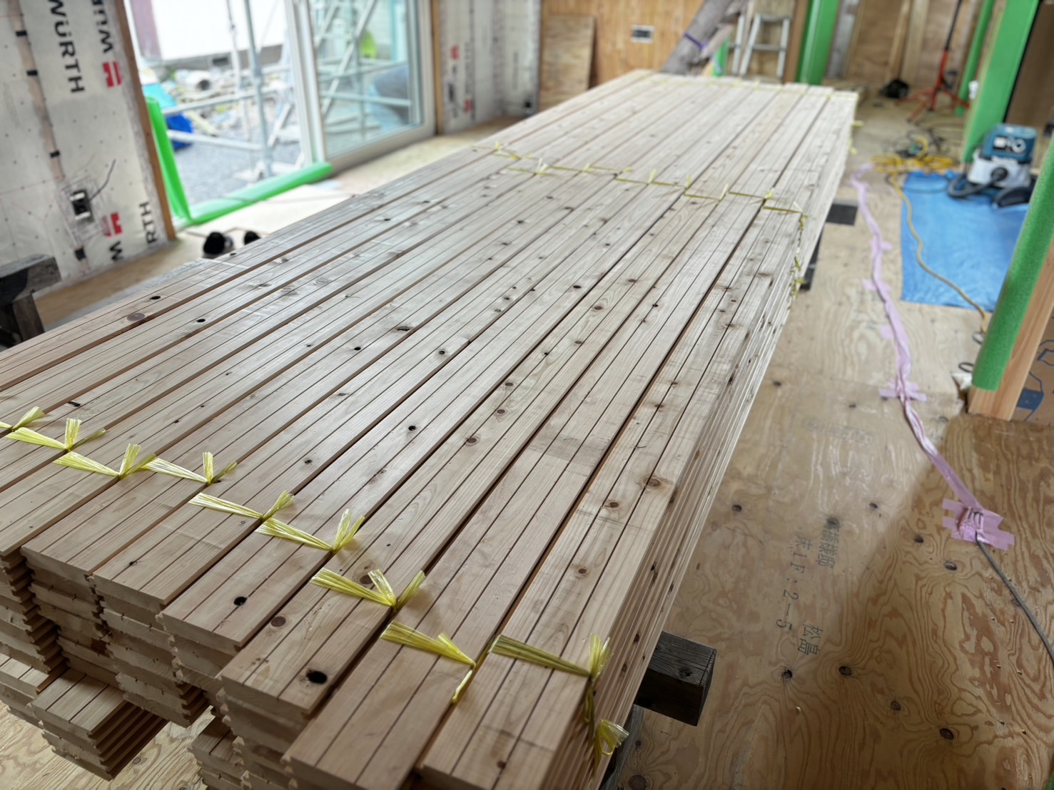 ↑桧の床板が来たことで更に木の良い匂いが現場内で増しました。今日から大工さんに張ってもらってます。