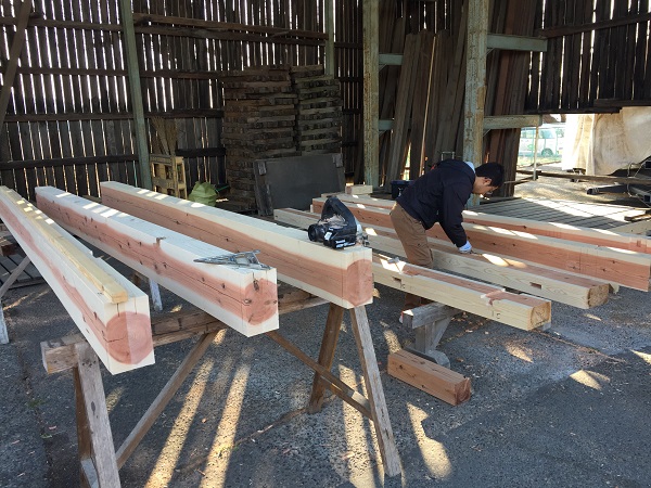 ウッドデッキを始めとして、住まい建物などの増築工事で、構造材は天然乾燥の杉・桧木材を今回は手刻みにて加工しています。
