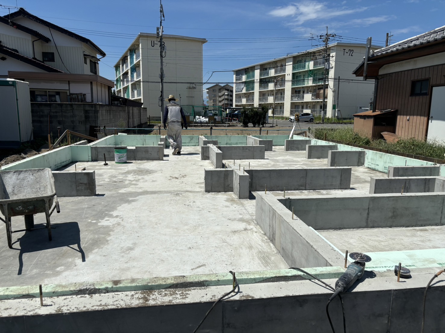 40.1℃という観測記録となった月曜日は、かなり暑かったですが、基礎屋さん、ポンプ屋さん、生コン屋さんのスムーズな連携のおかげで、基礎天端の高さを合わせるためのレベラーまできれいに素早くやっていただけました。