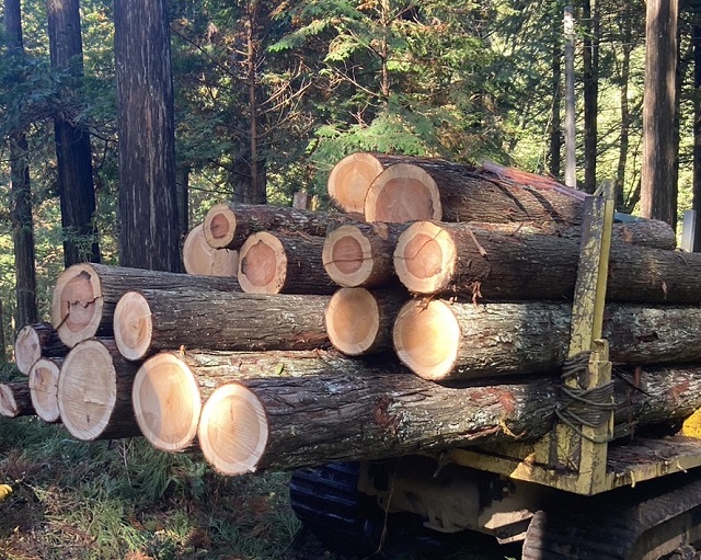 伐採見学の翌日には太い桧2本を更に伐採し、その翌日に秋山林業さんが山から搬出し製材所まで運搬して頂きました。