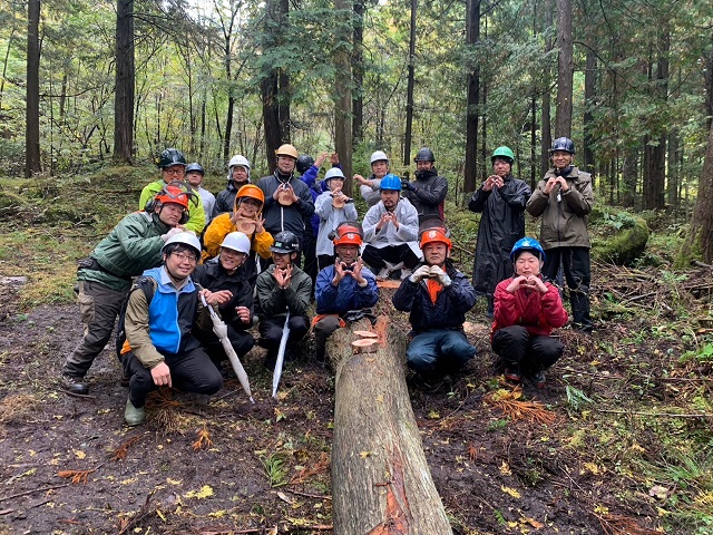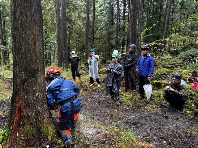 伐採見学日の11月2日は朝からあいにくの雨となりましたが、参加を申し込んだ皆さんは全員参加となり、山を知ろうという意気込みを感じさせられ、降っていた雨もほぼ止んでいました。