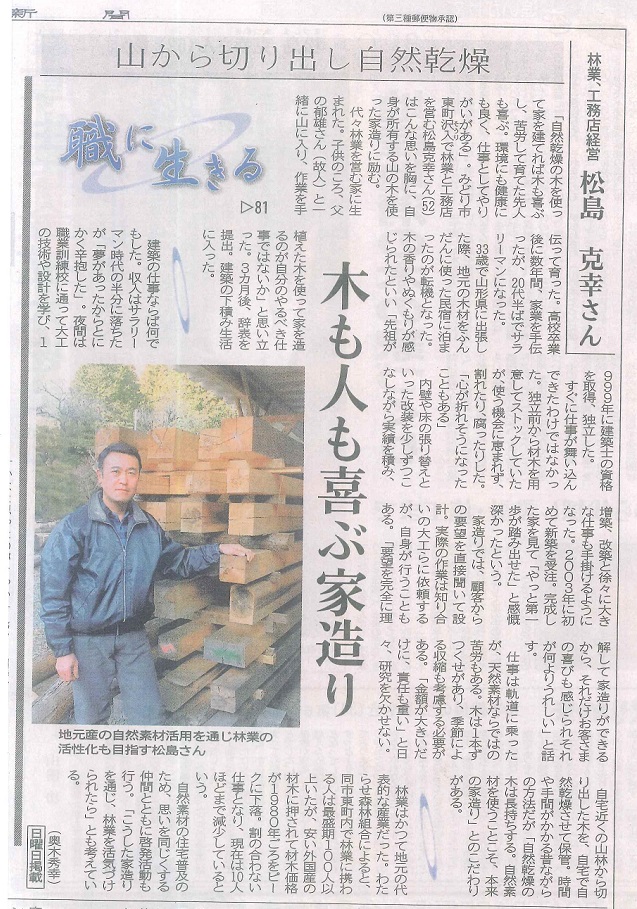 建築とは無縁なわたしが家づくりの道を目指したのは33歳の時でしたが、祖父や父達が苦労して育てた日本の木が見放されている時代に、その木を活かした家づくりが我が天職と閃きを得た事からでした。