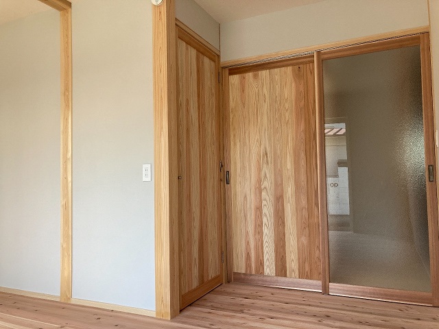 明り取りのガラス入りは框の内側がアクリルガラスですが、ガラス入り以外は内部も杉無垢板のオール杉の扉です。