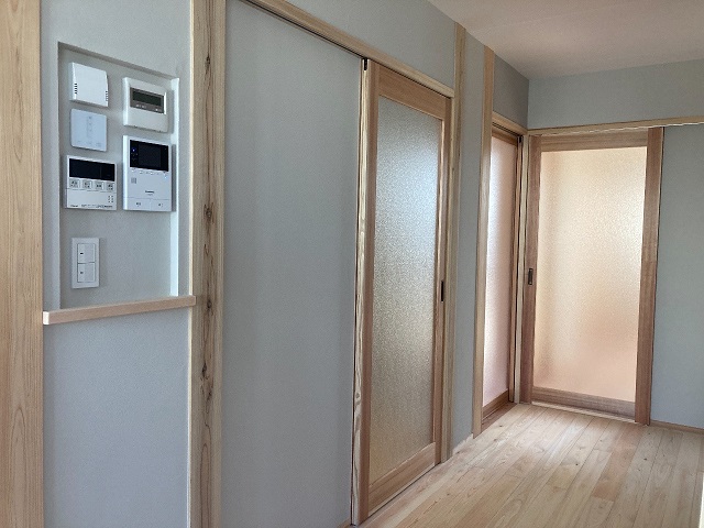 お引き渡しとなった前橋の家では、ゴールデンウイークのお休みを利用してお引っ越しの準備が進んでいました。そして内部の扉は今回から、現在息子の修業先である高崎市倉渕の中澤建設さんによる木製建具扉の採用でした。