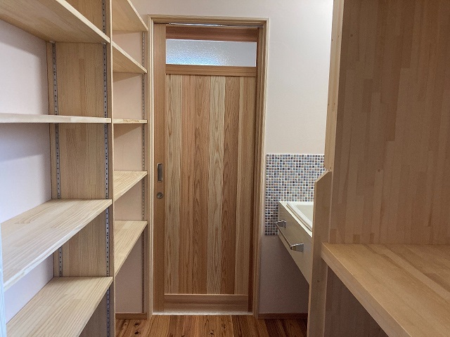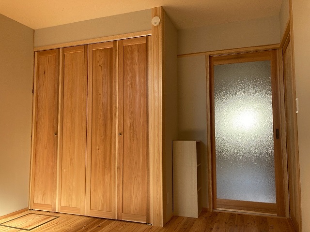 ↑ 杉無垢の折れ戸(左)に明り取り入りの片引き戸(左)