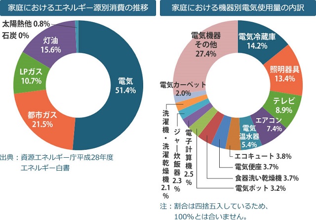 そしてこの40年間においての日本のエネルギー消費量の増加は、全体で約1.2倍に対して家庭部門では1.9倍と増加しており、冷暖房、給湯、生活家電と電気に依存した生活となっています。