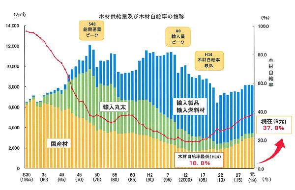 上の表は日本における木材の自給率(赤の折れ線)と国産木材、輸入木材の供給量(棒グラフ)です。