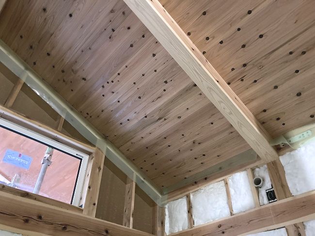 吹抜けの天井は勾配天井で、気密シートに胴縁打って、杉の羽目板を張っています。