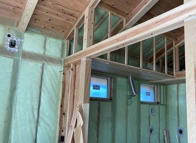 天井の垂木間、そして外壁の壁間充填断熱は高性能グラスウール16K120mm。