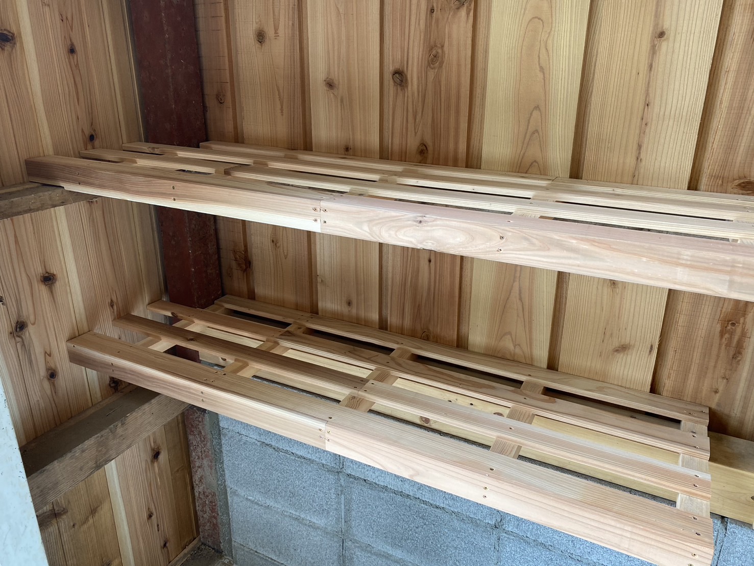 片持ちの棚にしたので、棚板部分はスノコ状にすることで棚自体の重さを軽減するとともに、外に近い場所なので埃が溜まりにくくなるかもと考えてこのようにしてみました。完成後も原田さんやトモさんにアドバイスをいただけました。もっと荷重に耐えられるようにする方法や曲がらずに取り付ける方法など、とても為になることをたくさん教えていただけたので、学ぶことが多かったです。もっとこうすれば良かったということはありますが、自分が考えたものを自分で作ったことに大きな意味を感じました。